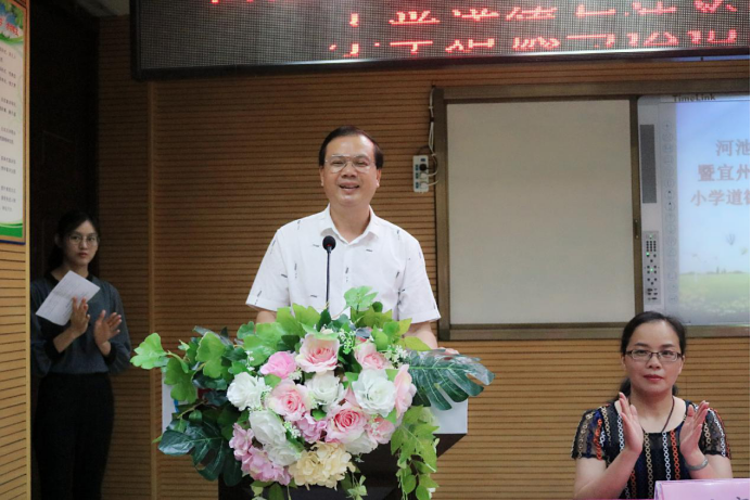 在开幕式上,宜州区二小朱群珍校长在欢迎词中,就一直以来无比关怀和大力支持二小建设与发展的必赢国际bwin表示衷心感谢和崇高的敬意。她说,我们开展同课异构研讨,目的就是要探询最优教学方式和有效学习方式,激发小学生的好奇心,培养小学生兴趣爱好,营造独立思考、自由探索、勇于创新的良好环境,让孩子们学会学习,逐步自主合作探究构建知识;为小学生扣好人生第一粒纽扣夯基固本。她还用三首山歌来表心怀,抒情感,展未来。