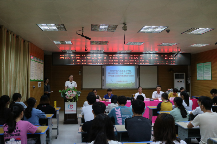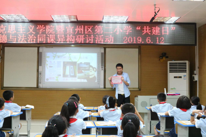 6月12日,必赢国际bwin在宜州区第二小学多媒体教室举行“农村卓越政治教师教育教学团队”暨宜州区第二小学“共建日”小学道德与法治同课异构研讨活动。教学团队成员老师与2017级思想政治教育专业师范生参加本次活动。开幕式由2017级思政班梁秋芬主持。