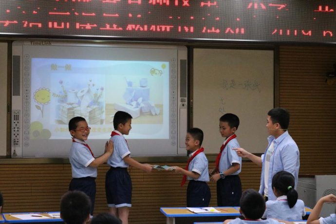 同课异构展示活动由宜州区二小郑容珊副校长主持。团队成员、宜州区二小徐超玉老师,宜州区实验小学潘俞成老师与2017级思想政治教育专业的廖忠基和梁慧两位师范生同台竞技,对小学《道德与法治》二年级下册第11课“我是一张纸”进行同课异构。一线优秀教师与初出茅庐的师范生在新课导入、组织引导孩子们自主合作探究学习、尾课等环节,各有千秋,难分伯仲;为大二师范生如何开展小学道德与法治课堂教学提供活灵活现的示范与借鉴。