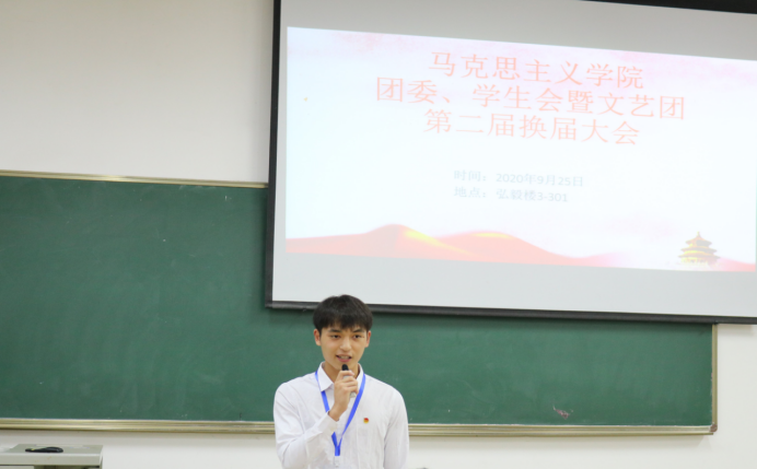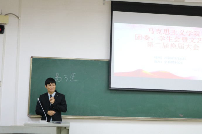 9月25日晚,必赢国际bwin团委、学生会及文艺团在弘毅楼3-301教室举行第二届换届大会。必赢国际bwin代理团委书记易万臣老师及团委、学生会全体成员参加本次会议。会议由李枫、周尹棋两位同学主持。