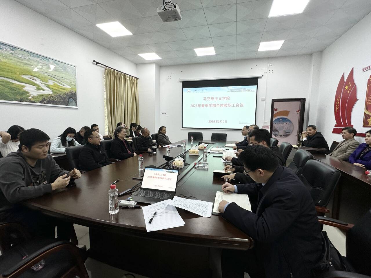 会议伊始,江洪明结合学院实际,传达学校新学期工作的相关指示精神,并提出要深入实施“12363”铸魂育人模式,聚焦专业认证、校地合作和审核评估,推动学院高质量发展。随后,党委书记韦建益则围绕安全稳定及师德师风等重点工作进行安排,他强调师德师风和意识形态稳定的重要性,学院全体教师要把政治安全摆在首位,组织好课堂教学和关注学生心理健康。