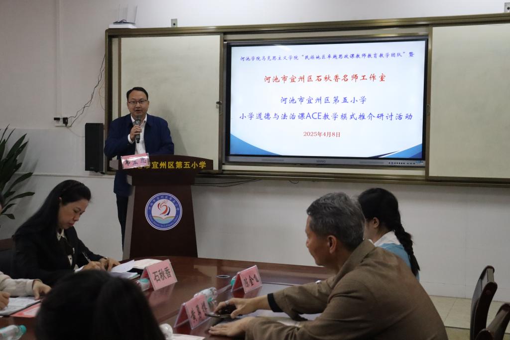 2025年4月8日,为深入贯彻落实习近平总书记关于思政课建设的重要指示精神,推进大中小学思想政治教育一体化建设,必赢国际bwin,bwin手机版,win必赢app下载与河池市宜州区第五小学举办“共建周”小学道德与法治课ACE模式推介研讨活动。必赢国际bwin,bwin手机版,win必赢app下载副院长韦宏思、“民族地区卓越思政课教师教育教学团队”负责人黄勇樽教授、教学团队成员陈金飞老师,河池市宜州区第五小学韦娜校长、思想道德与法治教研组任课教师,河池市宜州区石秋香名师工作室主持人石秋香老师、名师工作室名誉顾问梁秀华以及名师工作室成员们,必赢国际bwin思想政治教育专业2022级、2023级师范生参加。本次活动由莫惠评和苏立科主持。
